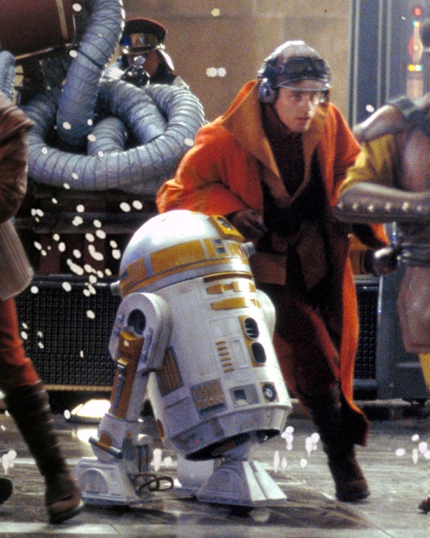 Gavyn Sykes escapes toward his starfighter with counterpart R2-C4 (Star Wars: Episode I)